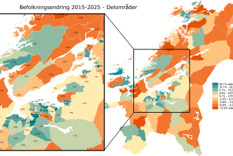 I Trøndelag har det historisk vært sterkere befolkningsutvikling i den såkalte aksen som følger Trondheimsfjorden og går fra Orkland i Sør til Steinkjer i nord, enn utenfor. I perioden 2020-2025 ser man tydelig at det er best befolkningsvekst rundt Trondheim og langt svakere befolkningsutvikling lenger nord i aksen. Steinkjer har som eneste kommune i aksen hatt nedgang i befolkningen med -1,2 % i perioden 2020-2025.